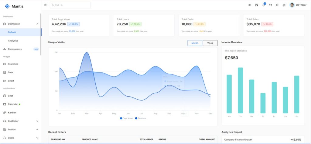 Vue.js is renowned for its gentle learning curve and blazing-fast performance, and the Mantis template showcases these strengths perfectly. Featuring a minimal, pragmatic design, this template ensures a distraction-free user experience.