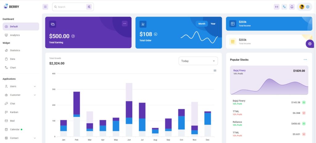 If you want an admin interface that pops with color and modern design aesthetics, Berry is a fantastic choice. It moves away from the traditional, stark corporate look and injects vibrant energy into your backend.