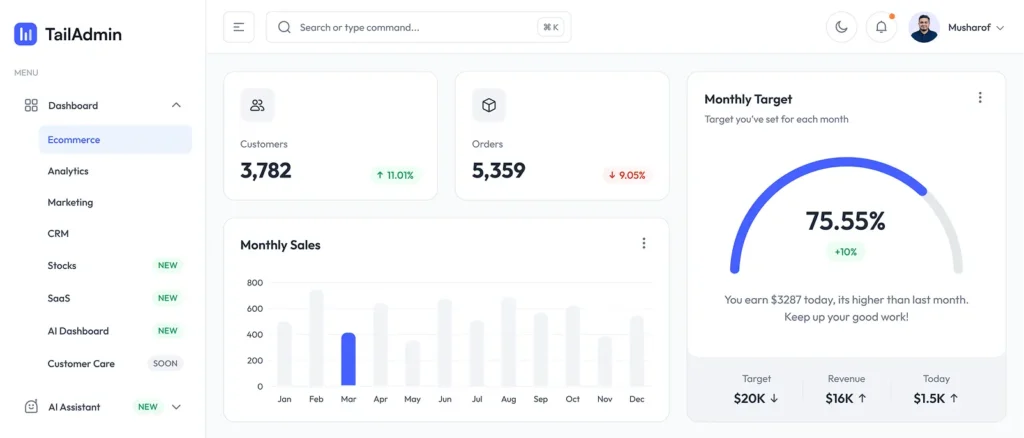 If you love the utility-first approach of Tailwind CSS, TailAdmin is an absolute must-have. This template provides a highly modular design built specifically for developers who want complete control over their styling without writing massive, custom CSS files.